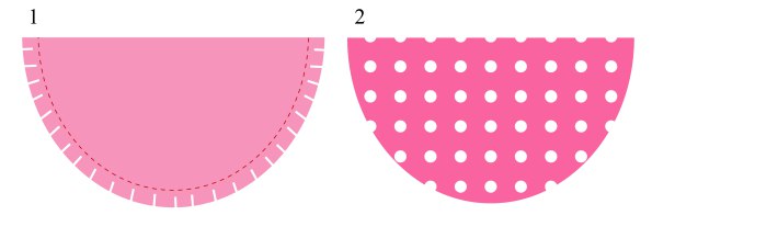 Schéma 1 : Poser les deux pièces de tissu endroit contre endroit, piquer l’arrondi sans oublier de faire les points d’arrêt de début et fin de couture ensuite recouper le surplus sur 0,5 cm et le cranter en faisant des petits triangles en vous arrêtant à 2 mm de la piqure point a